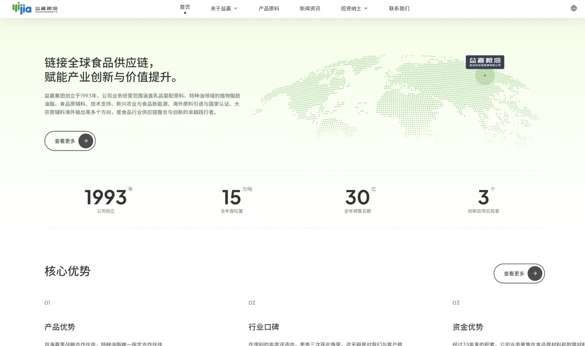 益嘉集团创立于1993年,公司业务经营范围涵盖乳品婴配原料、特种油领域的植物脂肪油脂、食品原辅料、技术支持、新兴农业与食品新能源、海外原料引进与国家认证、大宗原辅料海外输出等多个方向,是食品行业供应链整合与创新的卓越践行者